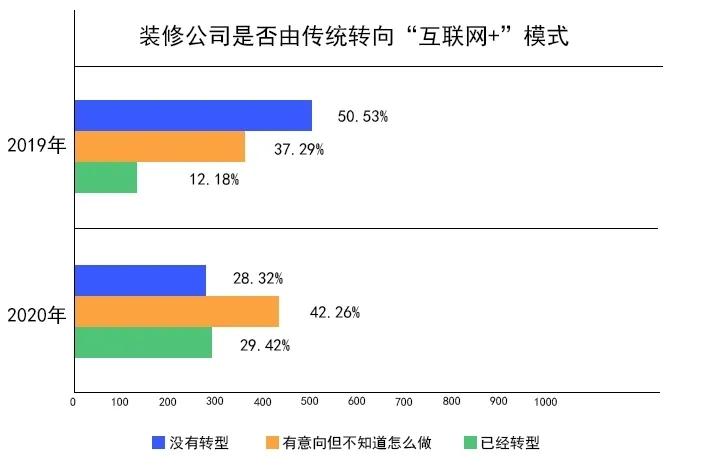 通過數(shù)據(jù)對比,我們可以看出2020年轉(zhuǎn)型升級的裝企比2019年多了17.24%,受疫情和市場大環(huán)境的影響,有更多的裝修公司意識到向互聯(lián)網(wǎng)轉(zhuǎn)型的重要性。從中小型裝修企業(yè)到品牌化裝修企業(yè),再到互聯(lián)網(wǎng)家裝??梢?,向互聯(lián)網(wǎng)轉(zhuǎn)型是裝修企業(yè)發(fā)展的大趨勢。