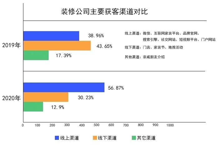 2020年通過線上渠道獲客的增長十分明顯,很大一部分原因是受疫情影響。疫情期間,線下的獲客渠道基本關(guān)閉,大多數(shù)的裝企才開始啟用線上辦公的模式,來進(jìn)行溝通協(xié)作。
