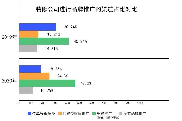 由數(shù)據(jù)表明,2020年宣傳單的廣告占18.25%,付費類占24.3%,免費推廣占47.2%,不做品牌推廣,佛系經(jīng)營的裝修公司還是占少數(shù)。