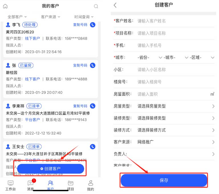 點(diǎn)擊我的客戶 -> 創(chuàng)建客戶 -> 填寫新增客戶訂單項(xiàng)目信息 ->點(diǎn)擊保存,即線下客戶創(chuàng)建完成。