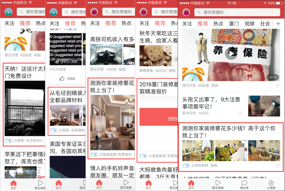 對于有家裝需求的用戶,特別是新房購買人群來說,他們最苦惱的事情莫過于家裝行業(yè)價格不透明。對此,眾易居裝修網(wǎng)通過使用家裝案例的實景圖片來吸引有相關(guān)需求的用戶,同時搭配文案“從毛坯到精裝入住,廈門只需7.68萬,全都是品牌材料”、“測測你家裝修要花多少錢?高于這個你就上當(dāng)了!”等等,廣告素材直擊“痛點”。