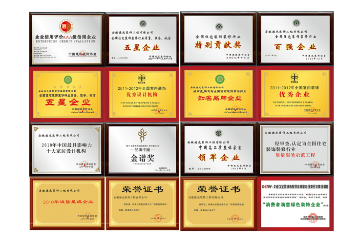 公司多年堅(jiān)持“少做廣告,多做實(shí)惠”,在裝飾市場(chǎng)領(lǐng)域里憑借高質(zhì)量、低價(jià)位而聞名安徽輻射全國(guó)。良好的信譽(yù)和多年的努力,成功樹立了公司自己優(yōu)秀的品牌形象,并連續(xù)獲得了“2010年中國(guó)最具影響力十大家居設(shè)計(jì)機(jī)構(gòu)”“消費(fèi)者滿意綠色裝飾企業(yè)”“品牌中國(guó)金譜獎(jiǎng)”、“質(zhì)量服務(wù)示范工程”等稱號(hào),在行業(yè)中具有較高的影響力和號(hào)召力。