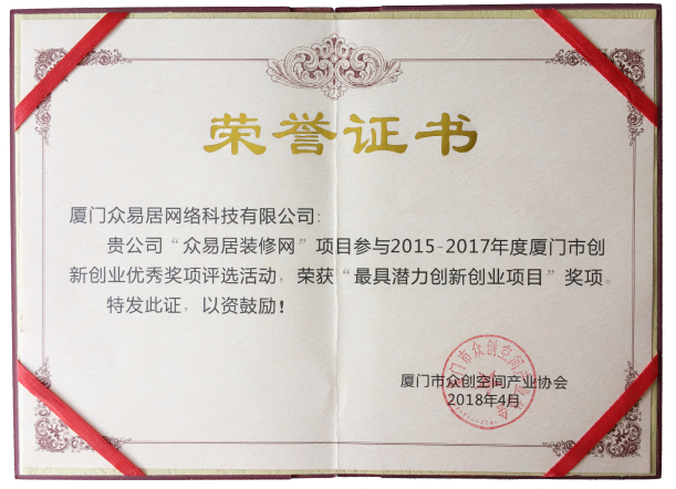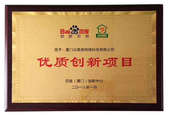 頒獎盛典上,眾易居獲百度創(chuàng)新中心力推,榮獲“2015-2017年度最具潛力創(chuàng)新創(chuàng)業(yè)項目獎”,是廈門互聯(lián)網(wǎng)裝修平臺中唯一一家被“廈門市眾創(chuàng)空間產(chǎn)業(yè)協(xié)會”評選上的企業(yè),這是對我們創(chuàng)新服務(wù)能力的一致認(rèn)可,也意味著我們將成為互聯(lián)網(wǎng)家裝行業(yè)最具潛力的創(chuàng)新力量!