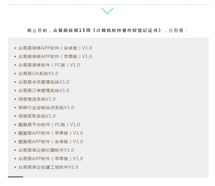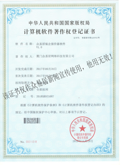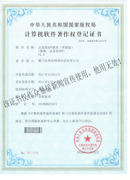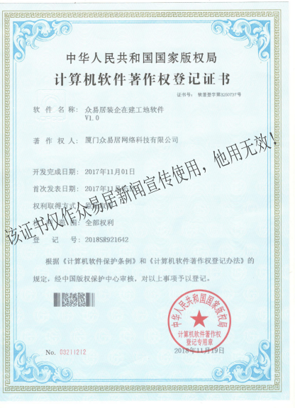 近日,經(jīng)中華人民共和國國家版權(quán)局審核考證,根據(jù)《中華人民共和國計(jì)算機(jī)軟件保護(hù)條例》和《計(jì)算機(jī)軟件著作權(quán)登記辦法》的規(guī)定,廈門眾易居網(wǎng)絡(luò)科技有限公司自主研發(fā)的“眾易居裝企報(bào)價(jià)器軟件V1.0”、“眾易居APP軟件(蘋果版)V1.0”和“眾易居裝企在建工地軟件V1.0”三項(xiàng)軟件產(chǎn)品獲得《計(jì)算機(jī)軟件著作權(quán)登記證書》,即日起,其版權(quán)將得到“中國版權(quán)保護(hù)中心”的有效保護(hù)。