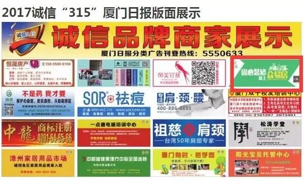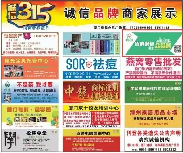 2017年3月15日,秉承營造安全的消費(fèi)環(huán)境,提供安全的商品和服務(wù),切實(shí)保障消費(fèi)者的合法權(quán)益!由廈門日報(bào)、廈門晚報(bào)、海西晨報(bào)共同發(fā)起的3·15誠信品牌商家榜單揭曉,廈門眾易居網(wǎng)絡(luò)科技有限公司旗下眾易居裝修網(wǎng)成功入選。屆時(shí),入圍品牌將會在廈門日報(bào)、廈門晚報(bào)及海西晨報(bào)“315專題”版面進(jìn)行品牌展示。