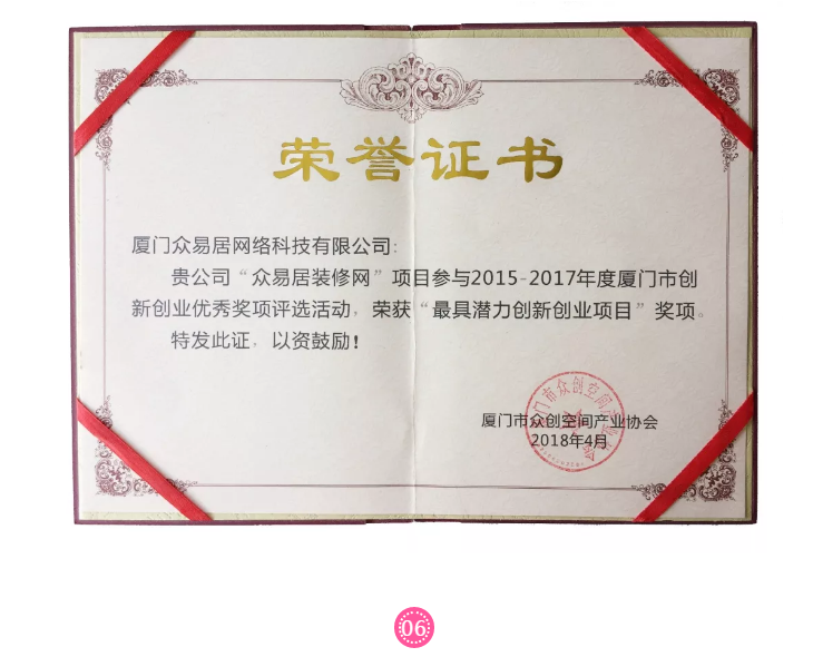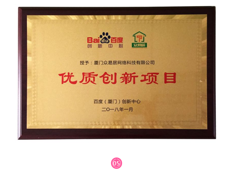 2018年4月,眾易居獲百度創(chuàng)新中心力推,榮獲“2015-2017年度最具潛力創(chuàng)新創(chuàng)業(yè)項(xiàng)目獎(jiǎng)”,是廈門(mén)互聯(lián)網(wǎng)裝修平臺(tái)中唯一一家被“廈門(mén)市眾創(chuàng)空間產(chǎn)業(yè)協(xié)會(huì)”評(píng)選上的企業(yè),這是對(duì)我們創(chuàng)新服務(wù)能力的一致認(rèn)可,也意味著我們將成為互聯(lián)網(wǎng)家裝行業(yè)最具潛力的創(chuàng)新力量;