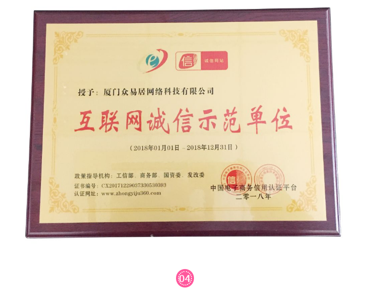 2018年1月,眾易居已正式通過(guò)中國(guó)電子商務(wù)信用認(rèn)證平臺(tái)的審核,獲得由工信部、商務(wù)部、國(guó)資委、發(fā)改委聯(lián)合認(rèn)證頒發(fā)的“互聯(lián)網(wǎng)誠(chéng)信示范單位”榮譽(yù)稱號(hào),同時(shí),企業(yè)官方網(wǎng)站被授予“誠(chéng)信示范網(wǎng)站”,收錄至全國(guó)誠(chéng)信網(wǎng)站認(rèn)證評(píng)測(cè)權(quán)威檔案數(shù)據(jù)庫(kù);